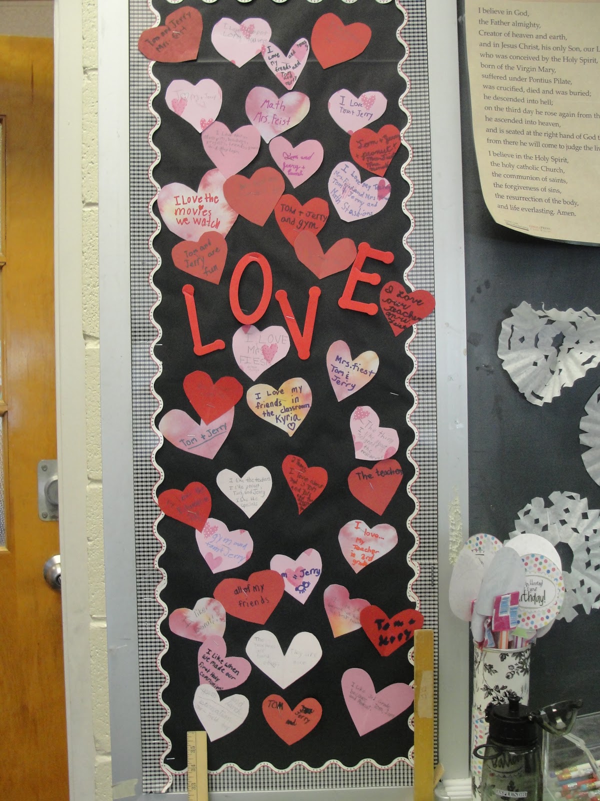 Cute idea I thought of for a small bulletin board. Since it is February, I had my students cut out heart shapes from scrap booking paper and write down things that they LOVE about 3rd grade. I put the word L O V E on the bulletin board and they each hung their hearts up. The top contenders of what they love,....Tom and Jerry, the guinea pigs!!